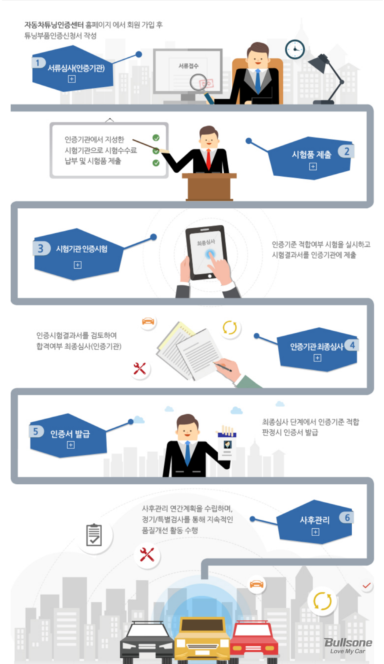 튜닝부품으로 인증 받기 위해서는 자동차튜닝부품인증센터의 절차를 통해 튜닝부품인증 신청서를 작성하고, 인증기관이 지정한 시험기관에 수수료(1개당 242,000원)와 함께 시험품을 제출하여 기준에 따라 적합여부를 판가름하게 됩니다. 인증시험결과서가 최종심사를 통과되면 인증서가 발급되며, 사후관리를 위한 연간계획을 수립과 정기/특별검사를 통해 지속적인 품질개선 활동을 수행해야 합니다.
