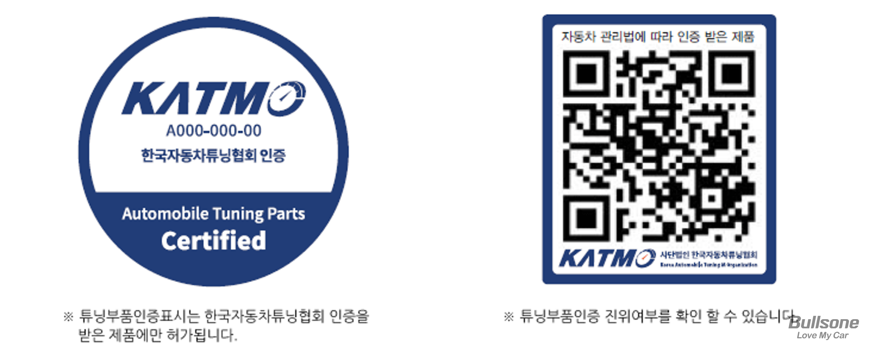 인증을 통과한 튜닝부품은 인증기관의 장이 발행한 인증표시를 하도록 규정되어 있습니다. 인증 표시 속 KATMO는 "Korea Automobile Tuning & Multipurpose Organizatin"의 약자를 의미하며, KATMO가 정상적인 튜닝부품으로 인정받은 인증로고가 됩니다.
