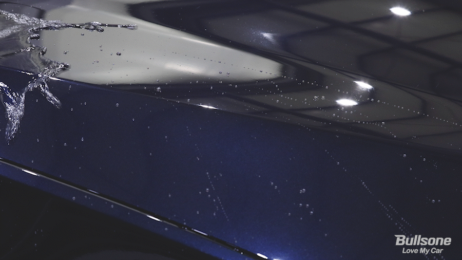 아직 24시간이 지나지는 않았지만 크리스탈 하이브리드 고체왁스의 강력한 발수력을 확인하기 위해 크리스탈 하이브리드 고체왁스가 시공된 도장면 위에 물을 뿌려보았습니다. 부드럽게 미끄러져 내리는 물방울로 크리스탈 하이브리드 고체왁스의 놀라운 발수력을 확인하실 수 있습니다.