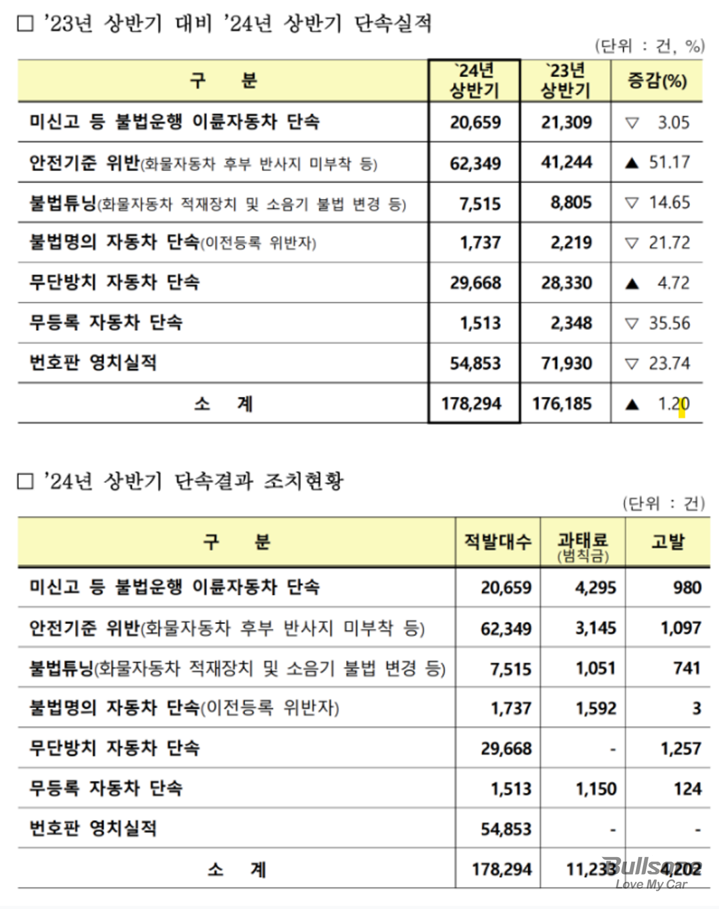 국토부는 지난 5~6월 상반기 집중단속을 통해 불법자동차 총 17만8000여 건을 적발했다고 밝혔습니다. 그 결과 5만4853건에 대해 번호판 영치, 1만1233건에 대해 과태료 부과, 4202건에 대해 고발조치 등 처분을 완료했으며, 이 적발 건수는 지난해 상반기보다 1.2% 늘어난 수치로 나타났습니다. 또한, 불법 등화장치 부착 등 위반 적발 건수는 51.17% 증가, 무단방치 자동차 적발 건수도 4.72%로 소폭 증가했습니다..