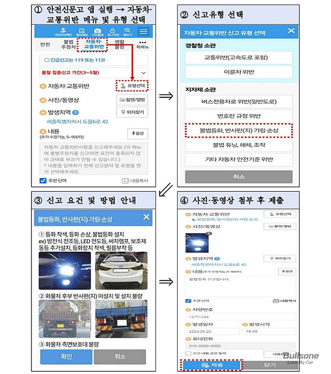 스마트폰을 통해 ①’안전신문고’ 앱에 들어가 자동차∙교통위반 메뉴에서 위반 유형을 선택합니다. 다음으로 ②신고 유형을 선택해야 하는데, 이는 두가지로 나뉩니다. 먼저 경찰청에서 관리하는 교통위반과 이륜차 위반, 지자체에서 관장하는 버스전용차로 위반(일반도로), 번호판 규정 위반, 불법등화, 반사판(지) 가림∙손상, 불법튜닝, 해체, 조작, 기타 자동차 안전기준 위반이 있습니다. ③안내되어 있는 신고 요건에 제보하고자 하는 차량이 부합하는지 확인합니다. ④다음으로 제보 차량을 사진 또는 동영상으로 찍어 첨부한 후 ⑤제출하면 간단하게 제보가 완료됩니다.