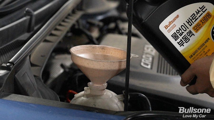 이때, 깔때기를 사용하면 훨씬 더 안정적으로 부동액을 흘리지 않고 넣을 수 있습니다.