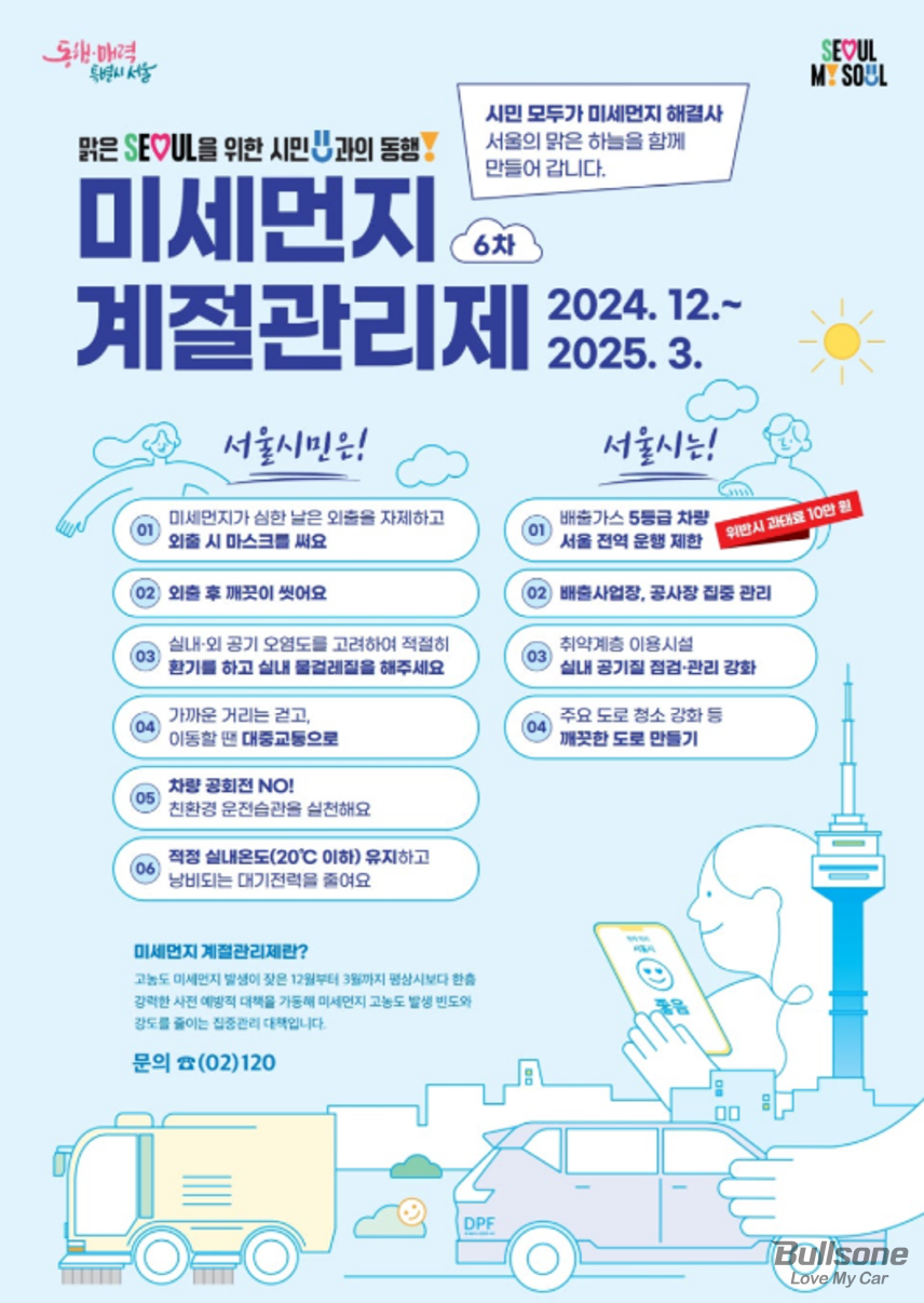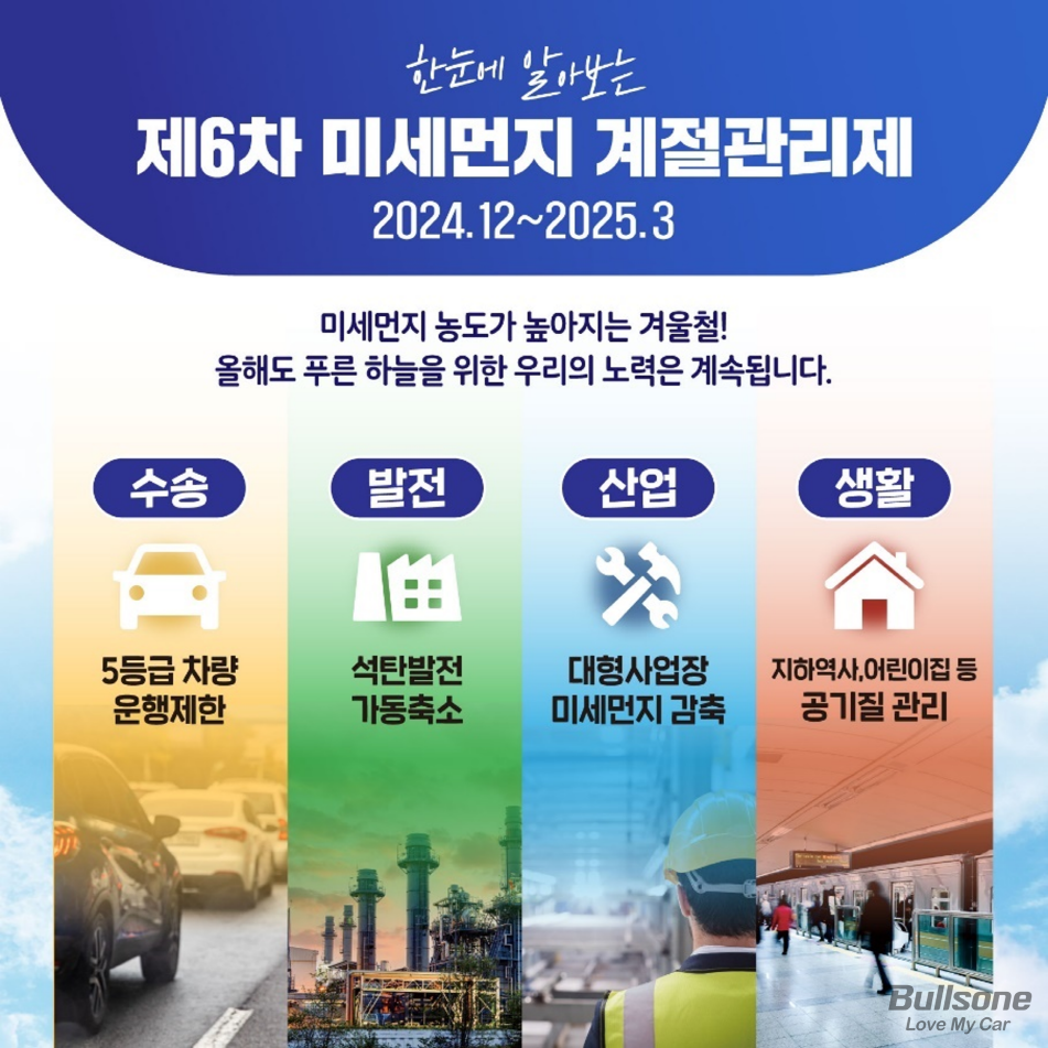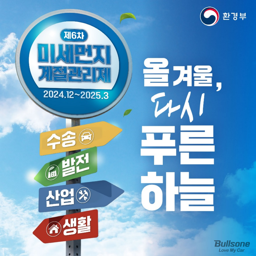 맑은 가을 하늘도 잠시 초미세먼지의 위협이 시작된 겨울, 시민들의 안전을 위해 정부는 2019년부터 ‘미세먼지 계절관리제’를 시행하고 있으며 벌써 올해 제6차 시행계획을 밝혔습니다. 미세먼지 계절관리제 시행규칙을 준수하므로써 조금은 깨끗한 공기를 유지할 수 있는 방법을 함께 알아보겠습니다.
