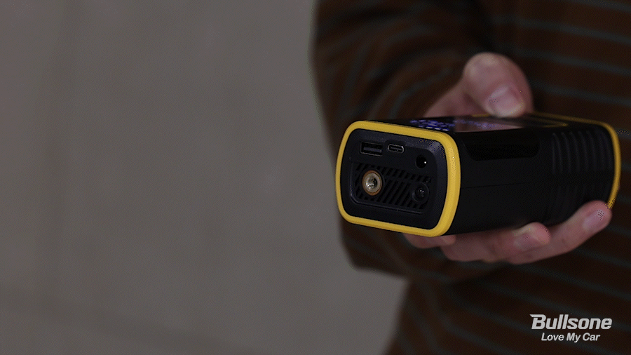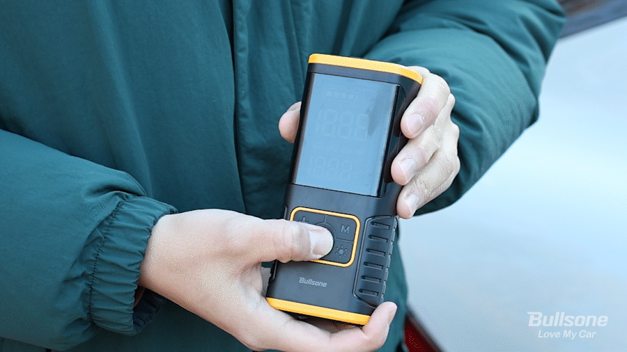 점프 스타터의 전원버튼을 2초 정도 누르면 전원이 켜지며, LCD 화면에 점프 스타터 배터리 잔량이 표시됩니다.