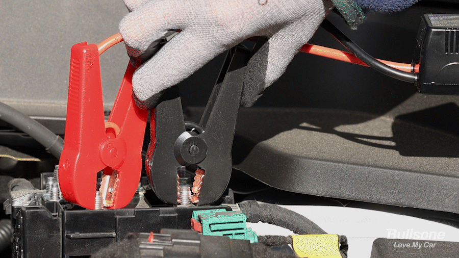 빨간색 집게는 자동차 배터리의 양극(+)에. 검정색 집게는 음(-)극에 연결해주세요.