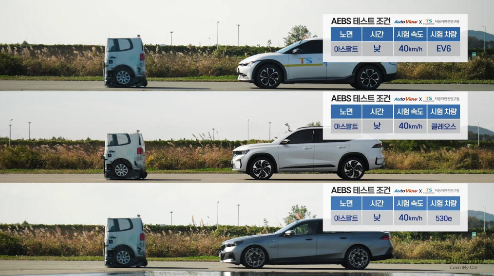 한국교통안전공단은 레벨 2 자율주행 기술인 첨단운전자보조장치의 안전성을 검증하기 위해 실험을 진행했는데요. 시험 대상은 기아 EV3, 르노코리아 그랑 콜레오스, BMW 530e 세 대의 차량이었습니다. 첫 번째 시험은 낮시간에 아스팔트 도로를 40km 주행하는 조건이었는데요. 첫 번째 시험은 다행히도 세 차량 모두 전방에 있는 장애물을 잘 감지해 충돌하지 않았습니다.