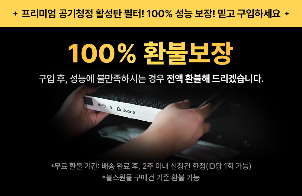 확실한 성능 뿐 아니라 성능에 불만족할 경우, 100% 환불까지 보장하는 프리미엄 공기청정 활성탄 필터! 더더욱 구매하지 않을 이유가 없겠는데요?