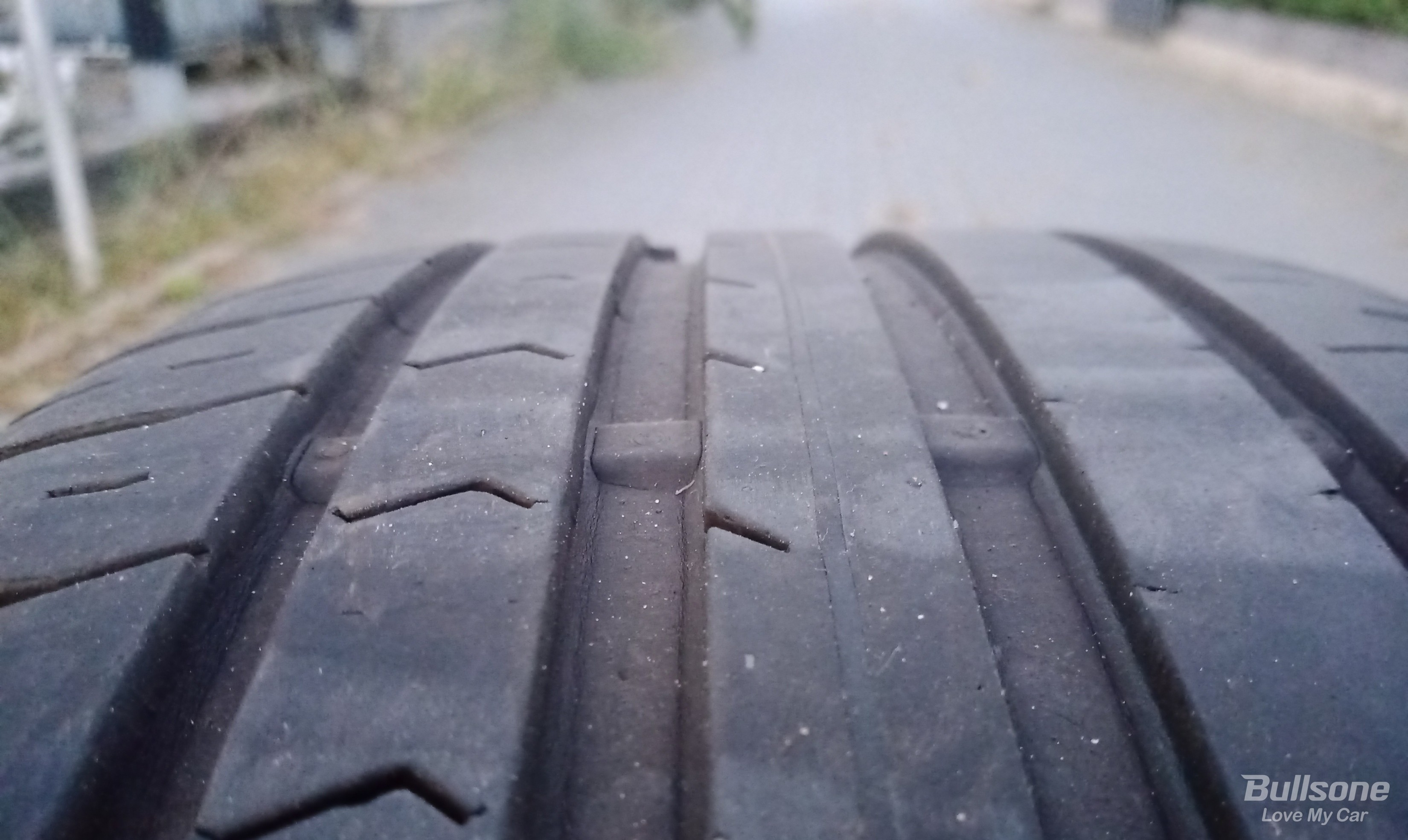 타이어 공기를 채우는 것은 물론 주행한지 10,000 km가 넘었다면 타이어를 분리해 위치를 옮기고 고르게 마모될 수 있도록 조정하는 것도 타이어 수명을 더 오래 유지할 수 있는 방법입니다. 타이어에는 다음과 같은 마모 한계선이 표시되어 있습니다.