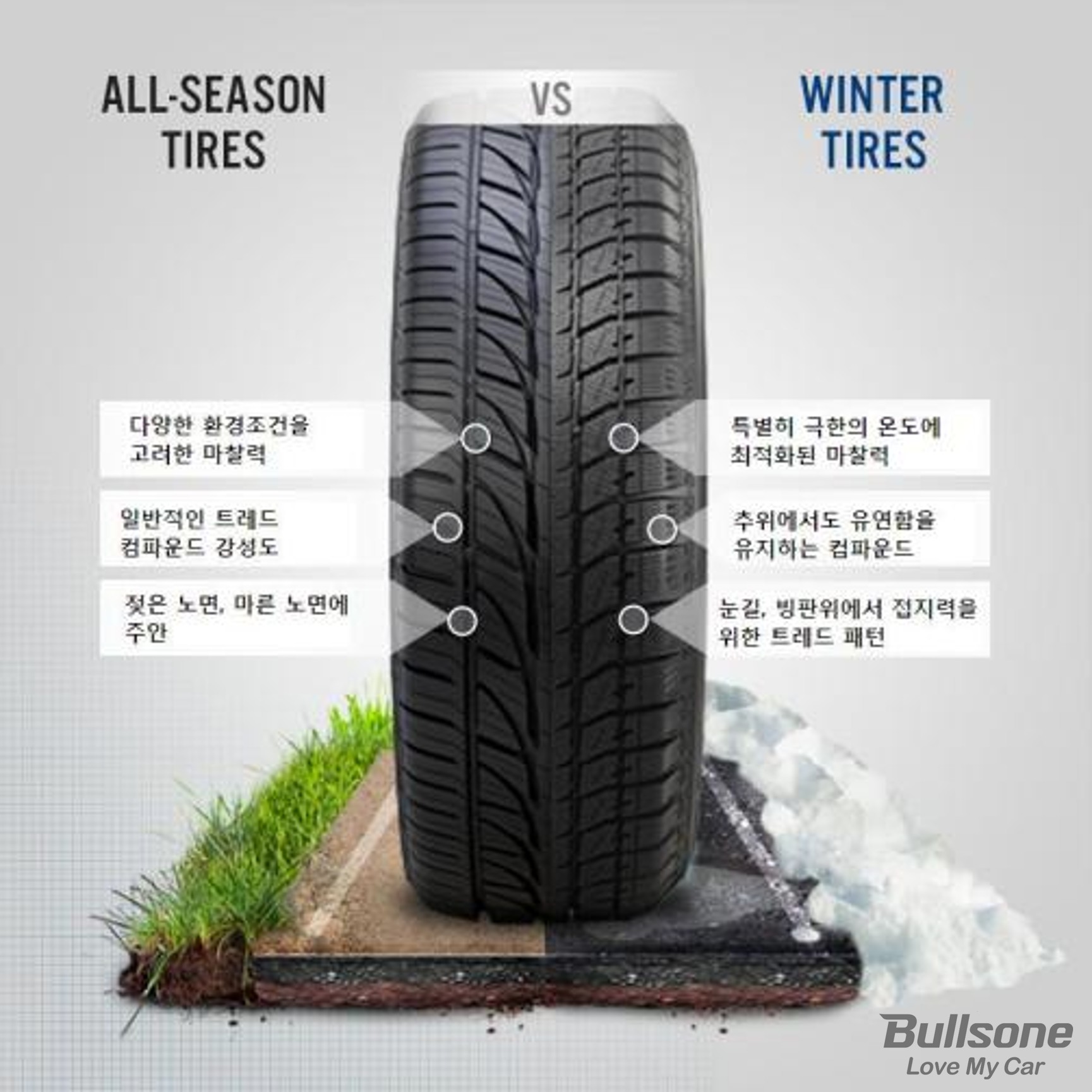 즉, 사계절용 타이어의 트레드는 직진 선보다 양 옆의 가로선 줄이 많은 것이 특징으로, 제동력을 높여 겨울에도 별도의 원터 타이어로 교체하지 않아도 사계절 내내 사용할 수 있습니다. 특별히 눈이 많이 오는 지역을 다니지 않는다면 계절의 변화마다 교체할 필요가 없다는 장점이 있습니다.