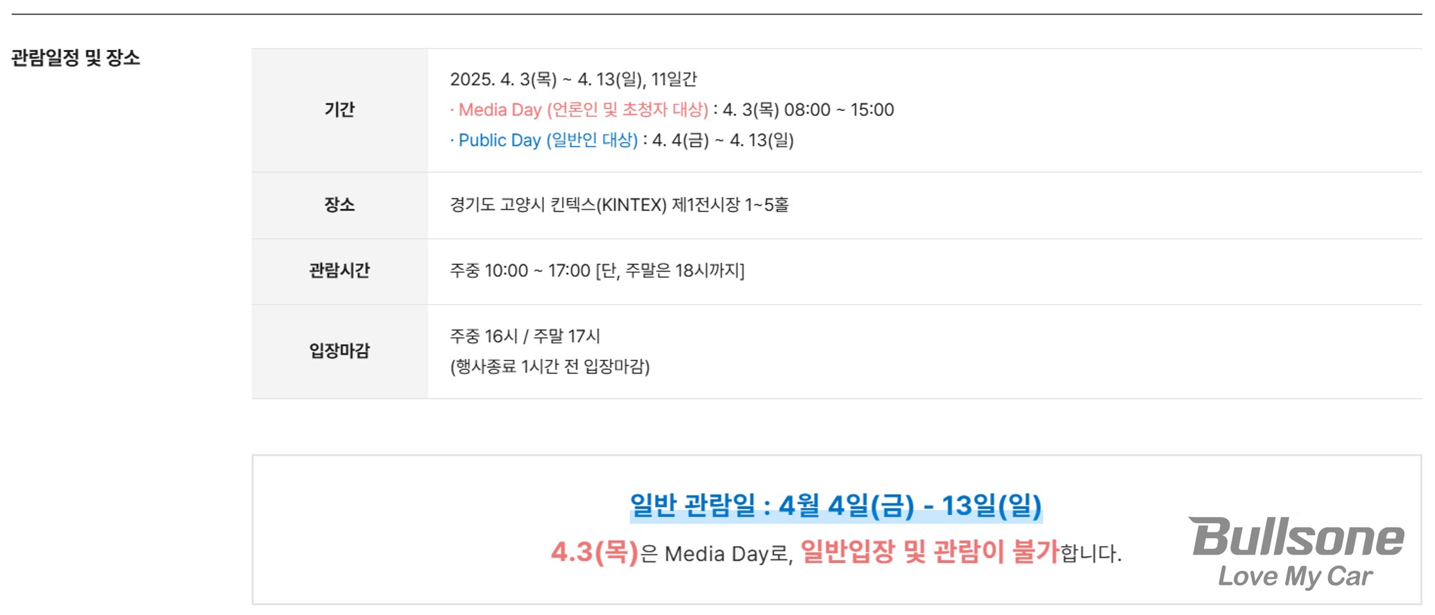 ‘2025서울모빌리티쇼’는 일반인을 대상으로 4월 4일 개장합니다(4/3 미디어 데이 진행 / 일반입장 및 관람 불가). 고양 킨텍스 제1전시장에서 개최되는 전시는 만 6세 이하 미취학 아동도 입장(무료입장 가능)할 수 있어 자동차를 좋아하는 아이들과도 함께 구경하실 수 있습니다.