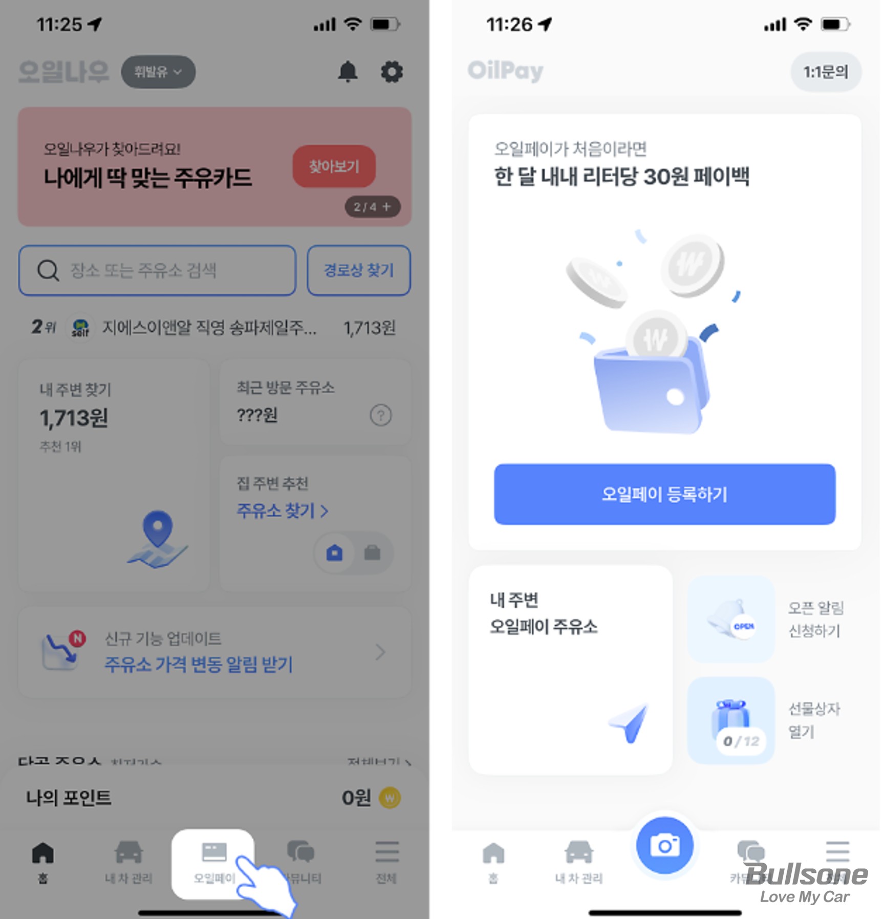 오피넷 이외에도 유가정보를 제공하는 서비스 플랫폼들이 많이 생겨났는데요. 특히 빅데이터 분석을 통해 운전자의 위치를 분석하고 저렴한 주유소를 추천하는 ‘오일나우’의 경우 자체 페이 시스템인 ‘오일페이’를 사용할 경우 리터당 30원을 할인을 받을 수 있도록 하는 등 다양한 프로모션도 진행하고 있습니다. (다만 오일페이가 가능한 가맹점이 정해져 있기 때문에 미리 내가 자주 이용하는 지역 주유소 중에도 오일페이 사용이 가능한지 확인을 할 필요가 있습니다.)