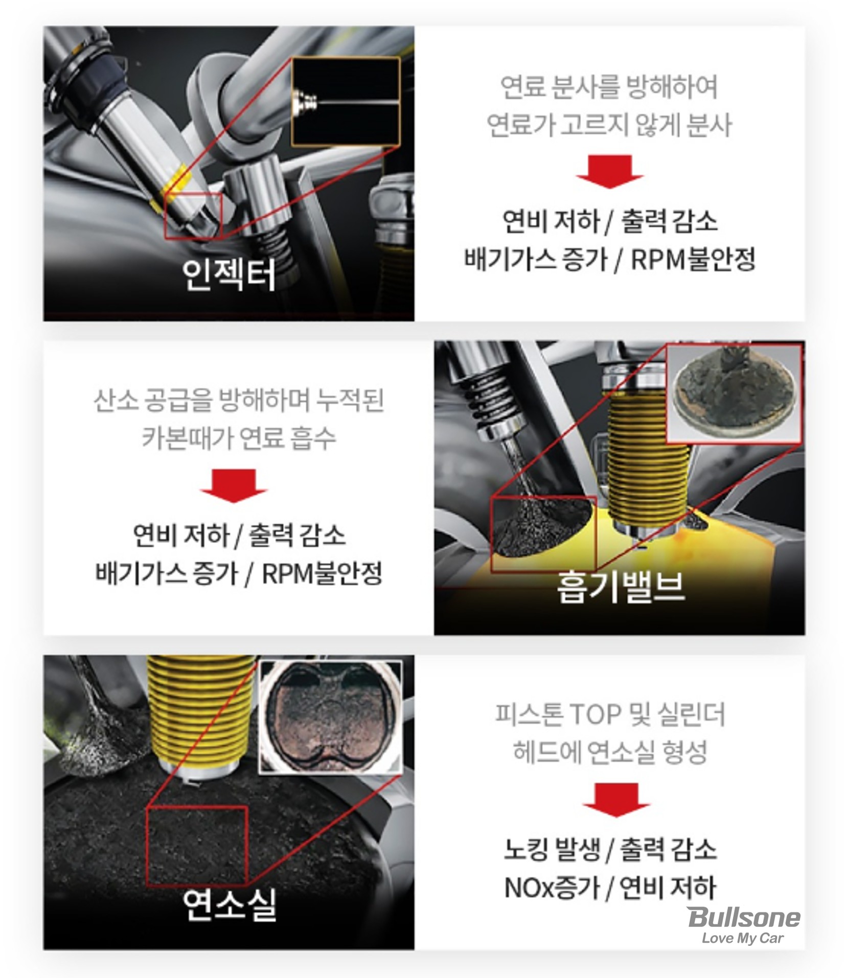 하지만 주기적으로(3,000~5,000km마다), 쉽게 계절변화에 맞춰 불스원샷을 활용해 엔진 때를 개선한다면 출력 증강, 연비 향상, 매연 감소, 소음 및 진동 감소 등의 효과를 볼 수 있습니다. 연료첨가제를 통한 엔진 관리 시 엔진 때를 생성 초기부터 억제할 수 있어 언제나 새 차 같은 엔진과 엔진 컨디션을 유지할 수 있습니다.