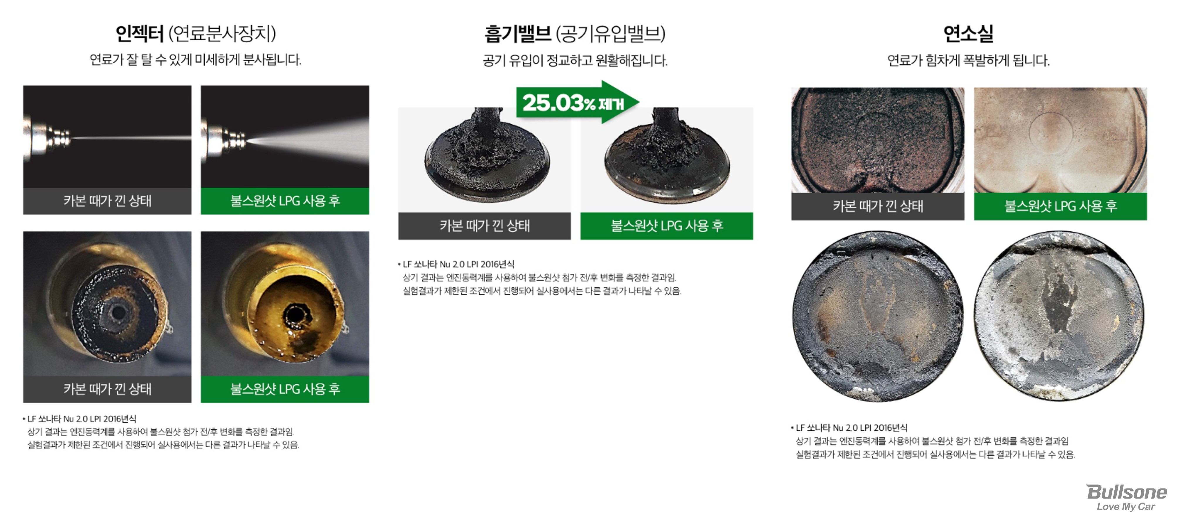 LPG는 화학적으로 순수한 탄화수소로 완전 연소를 하는 청정연료입니다. 엔진속에서 폭발과 연소가 수없이 반복되며 필연적으로 엔진 속에 타르와 그을음이 발생하게 되는데요. 엔진 속에 때가 쌓이게 되면 효율적인 연료활용이 어려워 연비가 떨어지고, 엔진 손상이 발생할 수도 있습니다. 이에 엔진을 보호하며 청소할 수 있는 연료첨가제가 필요한데요. LPG차량의 유일한 연료첨가제, 불스원샷을 사용하면 강력한 엔진 세정과 엔진 성능을 보호하는 효과를 볼 수 있습니다.