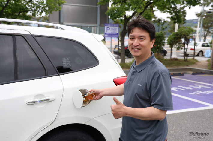구현정씨는 특이하게 디젤차로 연비왕 선발대회에 참가하셨는데요. 평소 8.2km/l의 연비로 주행을 하셨지만, 이번 연비왕 선발대회에서는 32km/l의 어마어마한 연비를 기록하셨습니다! 구현정씨는 기본적으로 연비가 좋은 하이브리드 차량을 이기기 위해 다양한 방법을 고민하셨고, 좋은 비결을 공개하셨습니다. 그 비결은 바로 엔진오일 첨가제 불스파워를 함께 주입하는 것입니다!