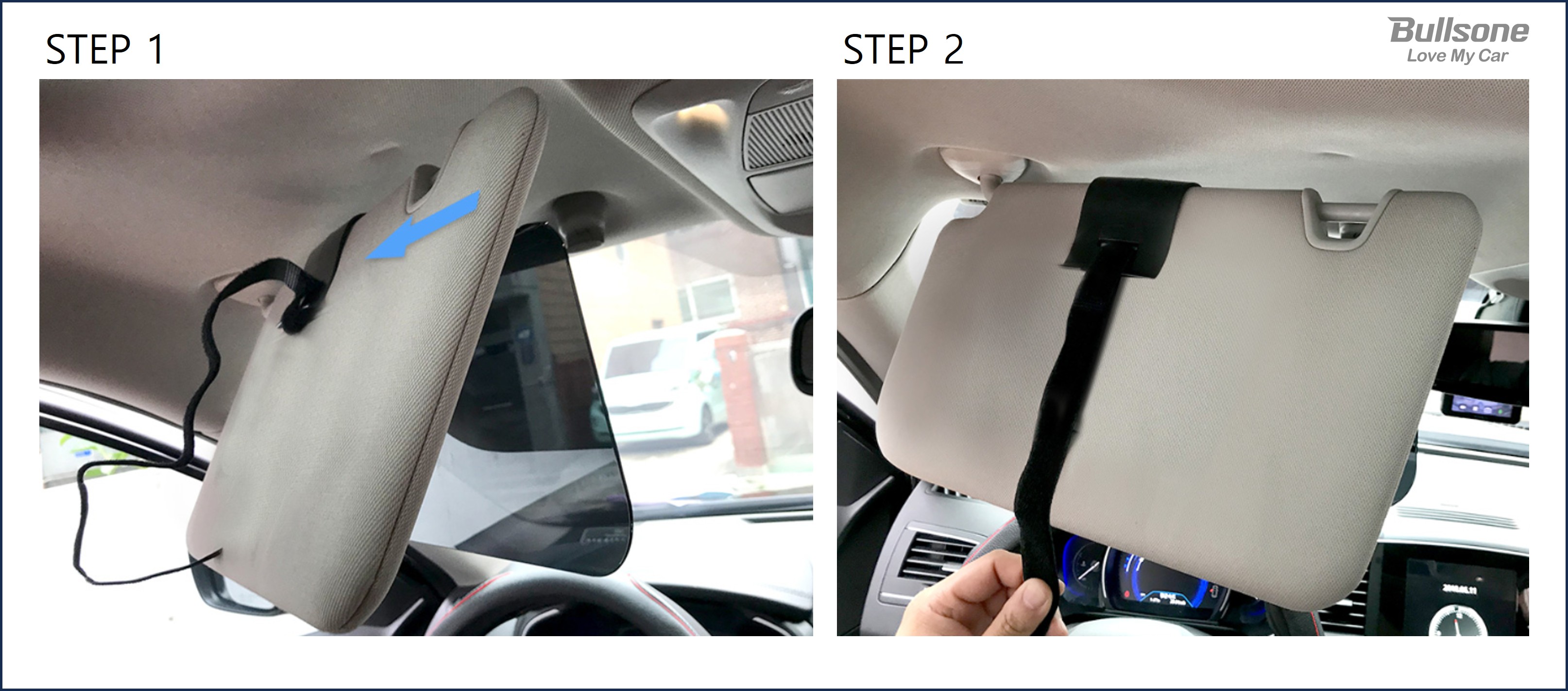 | *장착 방법, 기존 선바이저에 간단히 사용 가능! STEP 1 : 고정된 기존 선바이저의 한쪽 면을 빼내어 햇빛가리개의 클립을 밀어 넣어 끼워줍니다. 옆 쪽면을 통해 넣어 주면 쉽게 장착이 가능합니다. STEP 2 : 클립에 부착된 밴드를 선바이저 본체에 둘러 2중 고정하면 더욱 안정적인 사용이 가능합니다. |