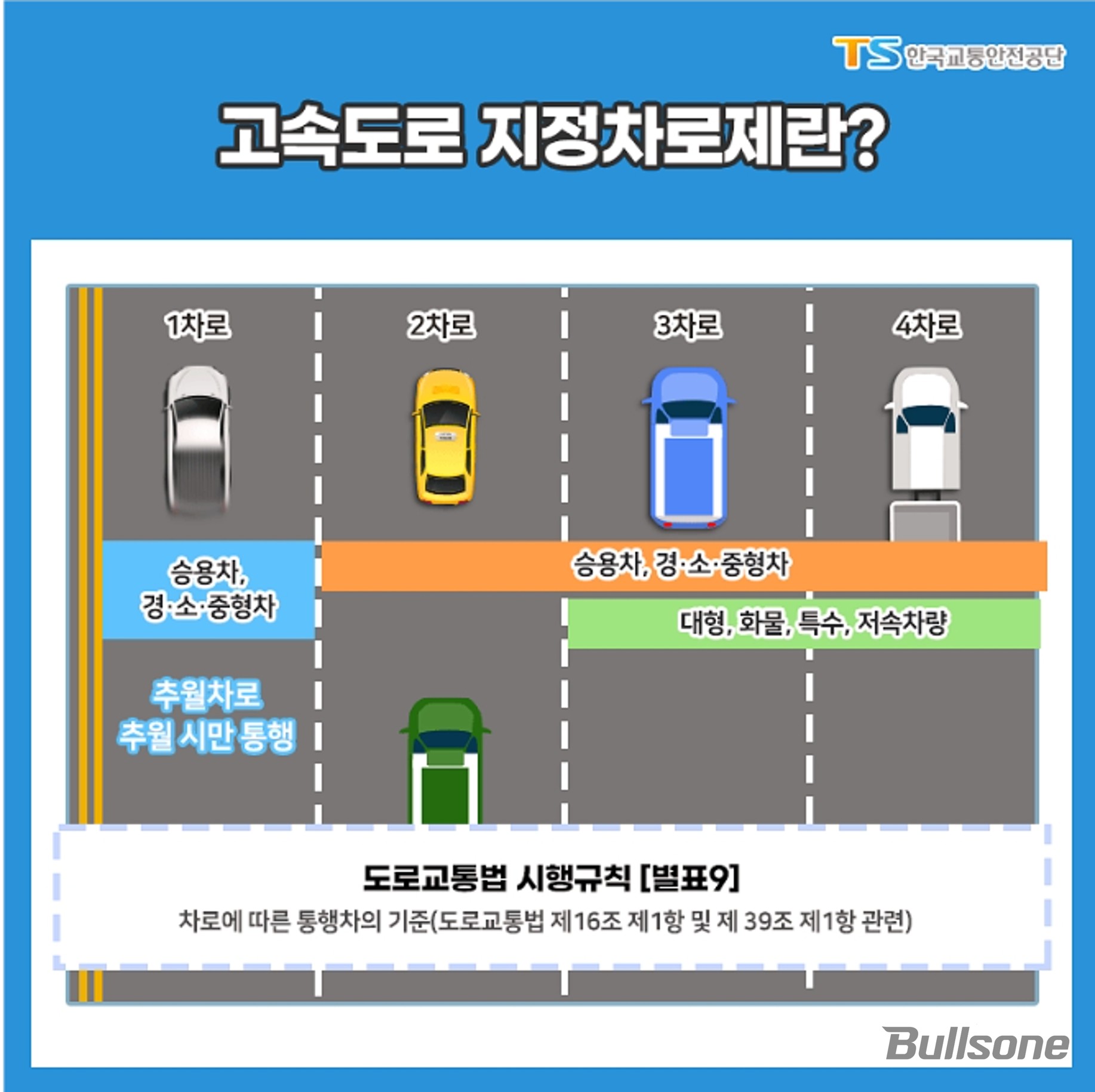 결론적으로 경찰청에 따르면, 두 입장 모두 조금씩 바로잡을 필요가 있습니다. 우리나라에서는 도로교통법 제60조에 따라 행정안전부령으로 고속도로 지정차로제에 대해 규정하고 있으며, 행정안전부령인 도로교통법 시행규칙 39조의 내용을 살펴보면 ‘차로에 따른 통행차의 기준’을 정하고, 고속도로 편도 2차로에서 1차로는 (부득이한 통행상황은 예외로 하나) ‘앞지르기를 하려는 모든 자동차’만 이용할 수 있다 정해져 있습니다.