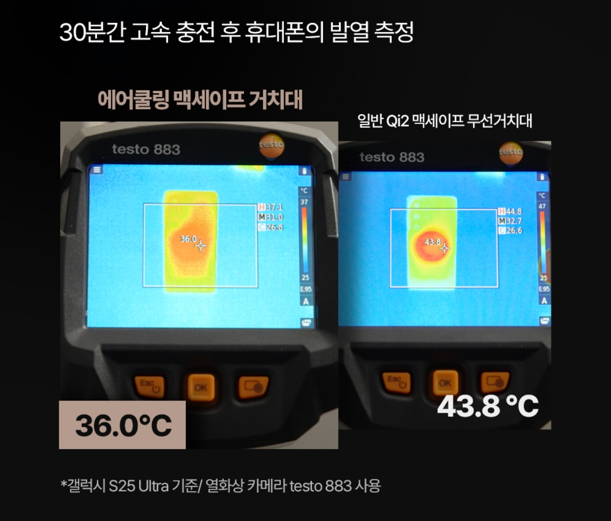 에어쿨링 맥세이프 무선거치대는 기존 스마트폰 무선충전 거치대의 가장 큰 문제점이었던 발열 문제를 저소음 쿨링팬 장착으로 해결했습니다. 거치대 내부의 저소음 쿨링팬은 스마트폰 발열을 억제 시켜 충전을 보다 빠르고 안정적으로 해준다는 사실! 최첨단 무선 충전 기술 규격인 Qi2 인증까지 통과해 Qi1 무선충전보다 2배 더 빠른 무선충전 속도를 자랑합니다.