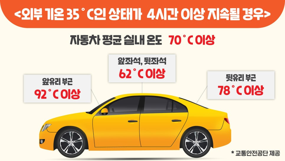 푹푹 찌고 더운 날씨로 인해 폭염 경보까지 발표된 요즘인데요! 이렇게 더운 날씨, 직사광선 아래 주차된 차량은 짧은 시간 안에도 내부 온도가 급격하게 상승하는데요. 외기 온도가 30도일 때, 차량 내부는 보통 5~60도, 극단적인 경우 7~90도 가까이 오르기도 합니다. 자동차는 뜨거운 열 에너지를 받아들이는 전면 유리 면적이 넓은 반면, 내부 공간은 구조상 밀폐되어 있으므로 열이 쉽게 빠져나가지 못하고 온실 효과를 일으키며 고온의 실내 환경을 만들어 내는 것이죠.