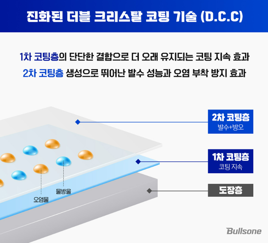 더블 크리스탈 코팅 기술로 생성된 1차 코팅층의 단단한 결합이 더 오래 유지되는 코팅 지속 효과를 내며, 그 위로 생성된 2차 코팅층은 뛰어난 발수 성능과 오염 부착 방지 효과를 냅니다.
