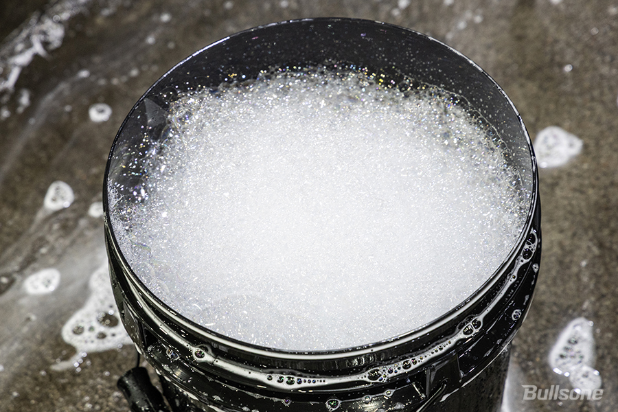 버킷에 카샴푸 적당량(30ml)를 풀어 희석해줍니다. 이때 고압건으로 부드럽게 거품을 내주면 더욱 풍성한 거품이 만들어집니다.