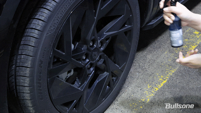 휠과 타이어 표면에 제품을 고르게 분사해주세요. 분사하자마자 타이어 겉면의 갈변이 뽑혀나오는 것을 육안으로 확인할 수 있습니다.