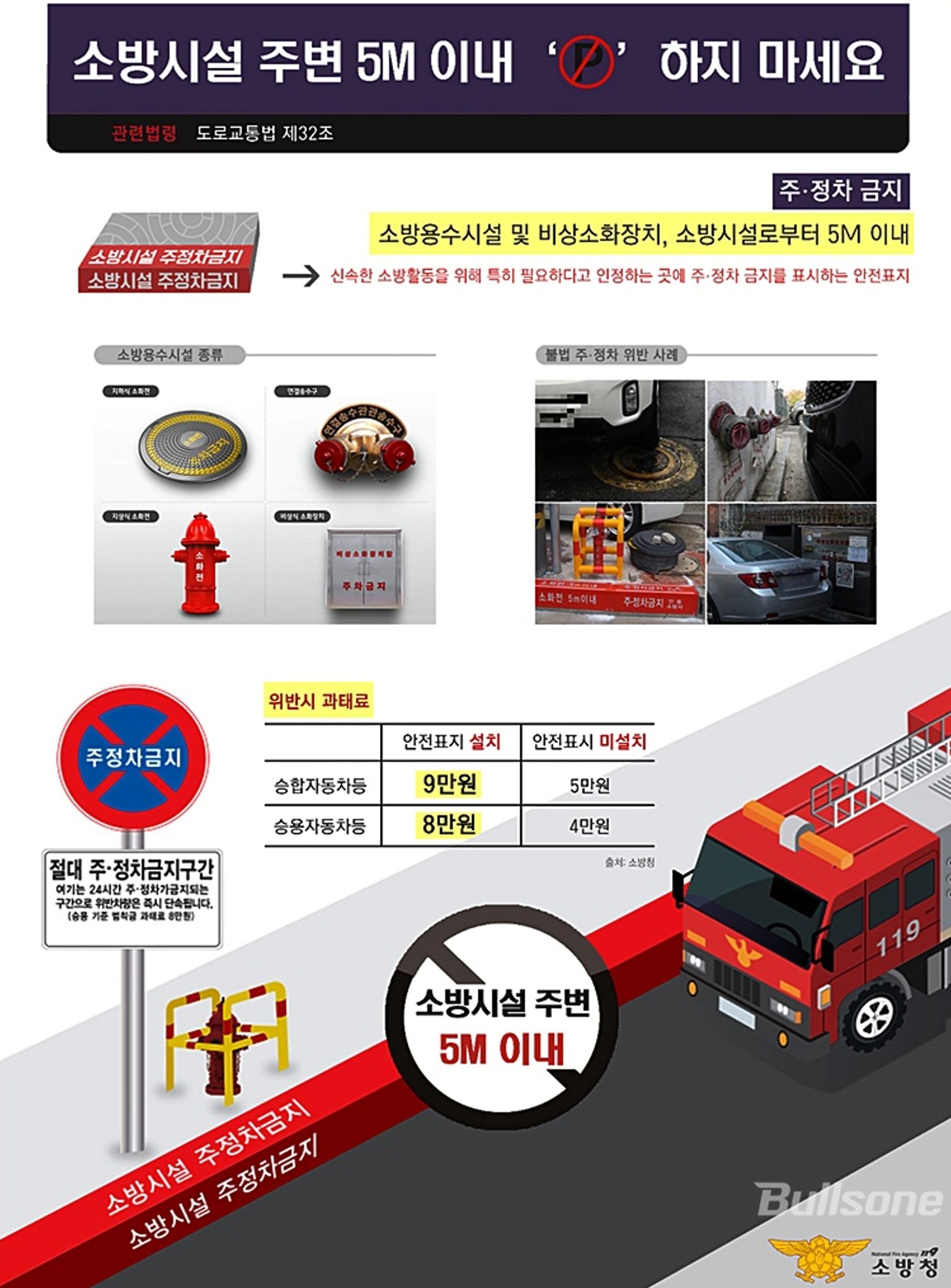 그 중 도로교통법 제 32조 6호에 따르면 ‘소방용수시설 또는 비상소화장치가 설치된 곳과 「소방시설 설치 및 관리에 관한 법률」 제2조제1항제1호에 따른 소방시설로서 대통령령으로 정하는 시설이 설치된 곳으로부터 5미터 이내에는 주차해서는 안된다’고 명시하고 있습니다.