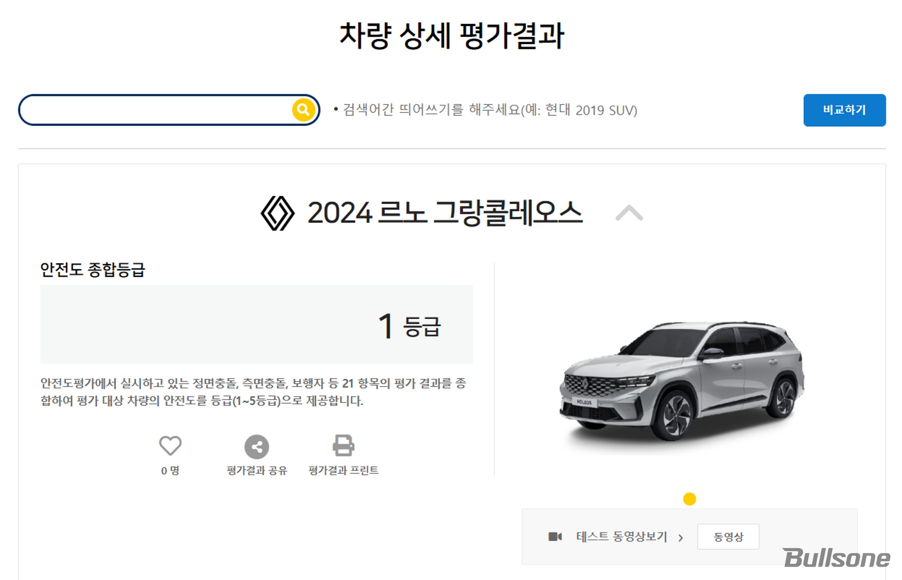 자동차안전도평가는 홈페이지를 통해 평가 결과를 조회할 수 있으며, 충돌안전성, 보행자 안정성, 사고예방안정성 3개 분야에 22개 평가 항목의 개별 점수를 종합하여 5가지 등급과 점수로 차량별 결과를 확인할 수 있습니다.