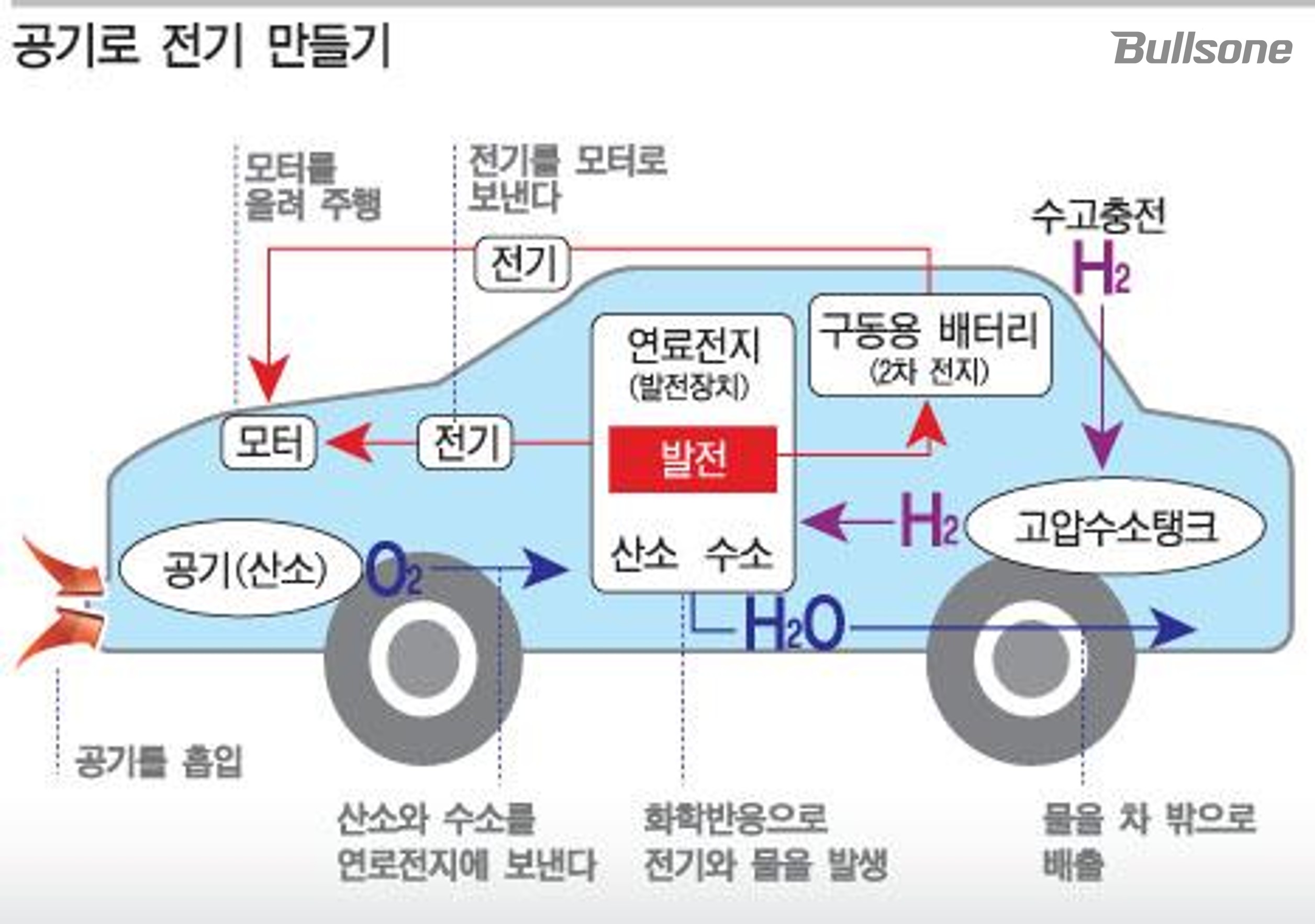 수소차는 이름 지어진 그대로 수소를 동력으로 움직일 것 같지만, 사실 수소차는 '수소'로 움직이는 자동차가 아닙니다. 자동차 내의 연료전지 스택에서 수소와 산소의 화학반응을 일으켜 자체적으로 전기를 만들고, 이를 모터로 보내면 모터는 전기 에너지를 운동 에너지로 바꿔 자동차를 움직입니다.