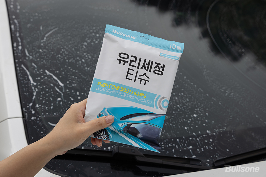 바로 불스원 유리세정티슈로 깨끗하게 닦아내주시면 됩니다. 유리세정 용액이 묻어있는 티슈로 한장씩 간편하게 꺼내어 앞유리창을 닦아내주시기만 하면 된답니다.