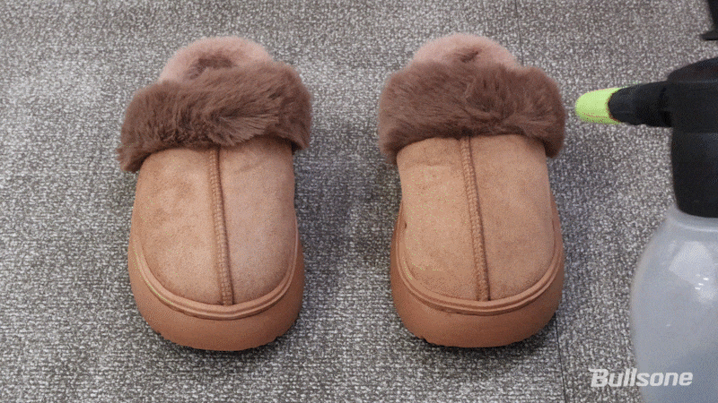 3. 15~20분 자연 건조 후, 비교를 위해 아쿠아쉴드 방수 스프레이를 분사한 좌측 어그부츠와 우측 어그부츠에 물을 분사해보았습니다. 좌측 어그부츠에는 물이 흡수되지 않고 또르륵 흘러내리는 반면, 우측 어그부츠에는 그대로 물이 흡수되는 것이 보이시나요? 이런 놀라운 방수 성능을 최대 6개월 동안 지속 가능하답니다!