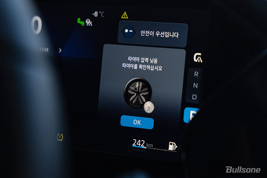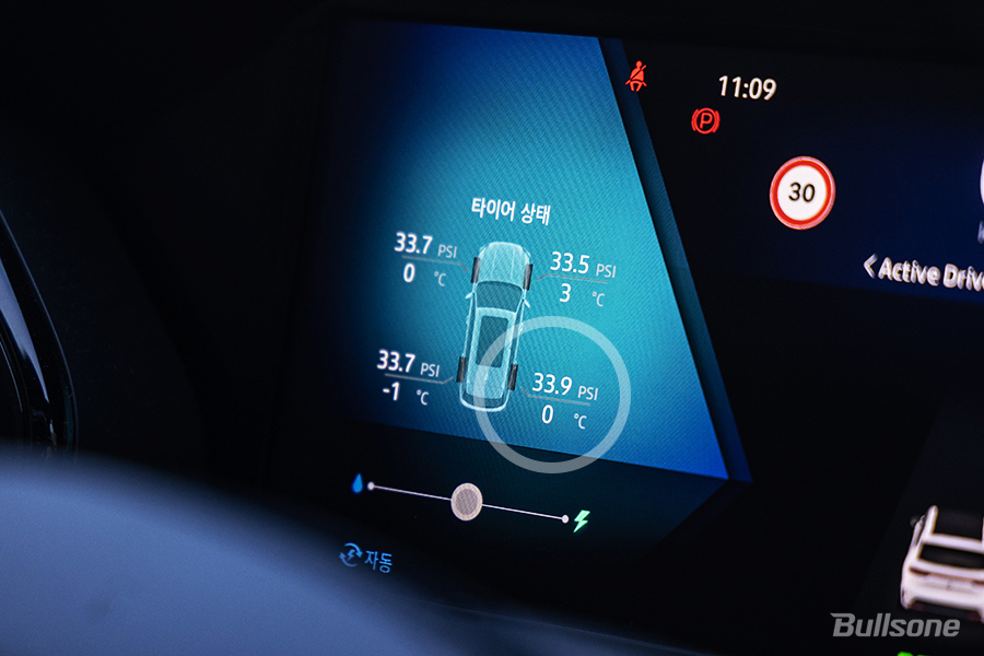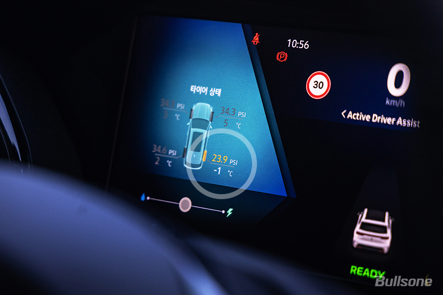 1. 계기판을 살펴보면 현재 타이어 공기압 상태를 알 수 있는데요. 겨울철 정상 공기압은 20인치 타이어 기준 36 PSI 이고, 현재 2열 우측 타이어의 공기압이 다른 타이어들에 비해 현저히 떨어져있으므로 다른 타이어들의 공기압과 맞춰주는 것이 좋습니다.