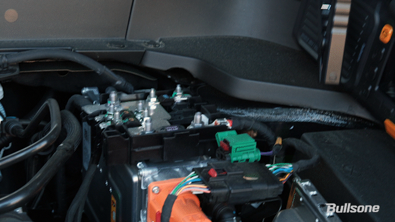 3. 자동차 본넷을 열어 배터리 캡을 열어주고, 빨간 클램프를 차량 배터리 (+) 단자에 연결합니다. 검은 클램프는 (-) 단자에 연결합니다. 스마트 클램프에 비프음과 함께 녹색 LED만 켜지면 점프스타터 시동이 가능한 상태입니다.