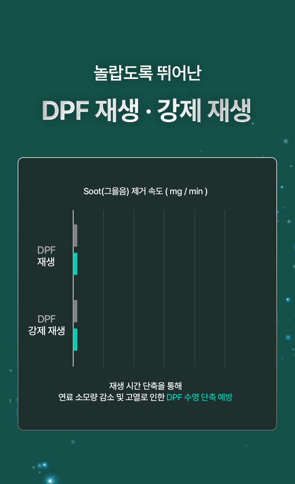실주행 테스트로 검증된 불스원샷 DPF 클리너 트럭·버스용의 DPF 보호 및 수명 연장 효과! 실제로 주입 전보다 주행로 그을음 증가 속도 감소 퍼센트 비율과 DPF 재생까지 주행 거리 증가 비율을 따져보았을 때, 불스원샷 DPF 클리너의 차별화된 사용 효과를 확인하실 수 있습니다.