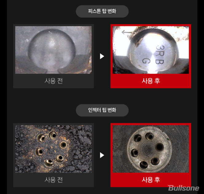 또한, 불스원샷 시그니처 딥클린은 고온의 엔진열에도 탁월한 세정 효과를 발휘하는 P.E.A.와 PIBSI 성분을 함유했습니다. 여기에 고온·고압 연소 기술이 적용돼 엔진 때가 쌓이기 쉬운 직분사 엔진의 인젝터와 피스톤탑까지 말끔하게 세정해주는 GDI/CRDi 부스터도 함유되어 엔진의 성능을 언제나 최적의 상태로 유지할 수 있게 해줍니다!