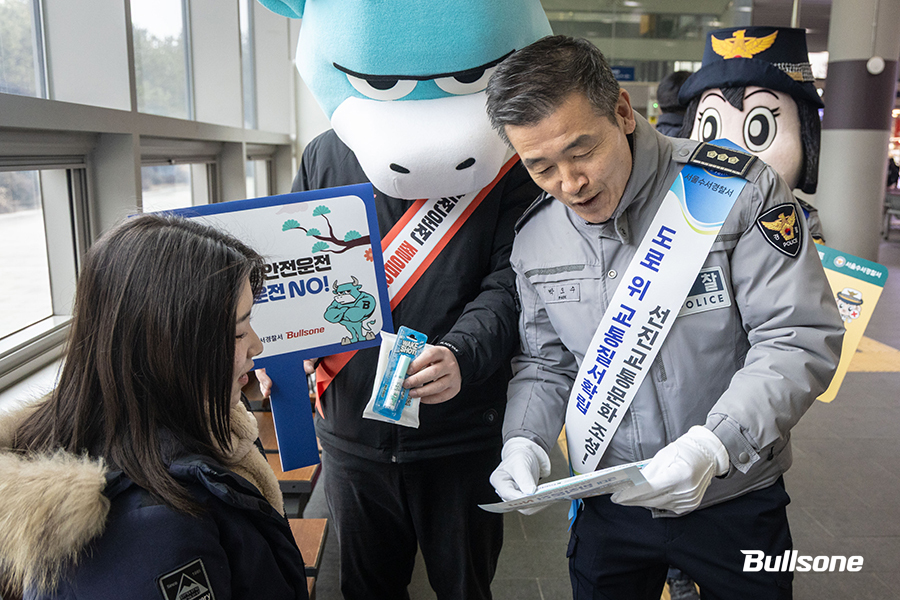 이처럼 사고 위험이 높은 설연휴! 안전하고 행복한 설날을 보내기 위해 불스원이 수서경찰서와 손을 잡았습니다! 얼마 전, 불스원은 교통사고 예방과 선진 교통문화 확산을 위해 수서경찰서와 업무협약을 맺었는데요. 그 첫걸음으로 지난 수요일 설 연휴를 앞두고 수서역 일대에서 귀성길 안전운전 캠페인을 진행했습니다! 흐리고 추운 날씨에도 많은 시민들과 함께했던 불스원과 수서경찰서의 교통안전 캠페인 현장을 함께 살펴볼까요?