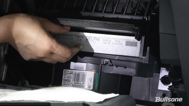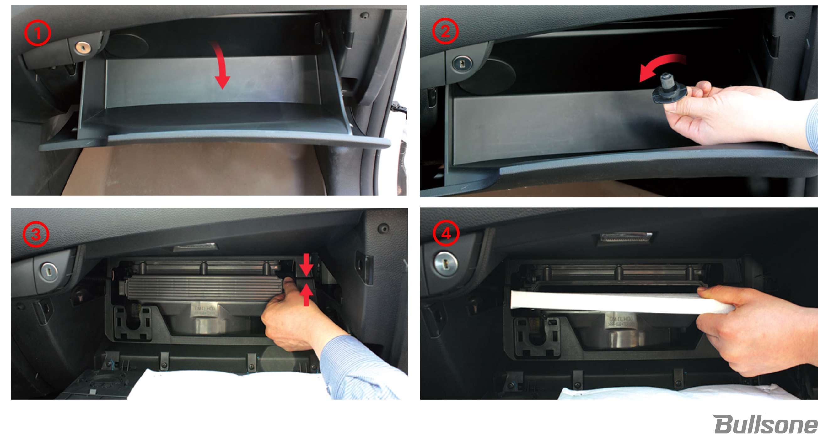 먼저 ① 조수석 하단의 글로브 박스를 열고 ② 글로브 박스 안쪽의 좌 · 우 고정핀을 돌려서 분리해줍니다. ③ 필터 덮개를 위 · 아래 또는 좌 · 우로 눌러 분리한 필터를 뺀 뒤 새 필터로 교체하고 역순으로 조립하면 교체가 완료됩니다.