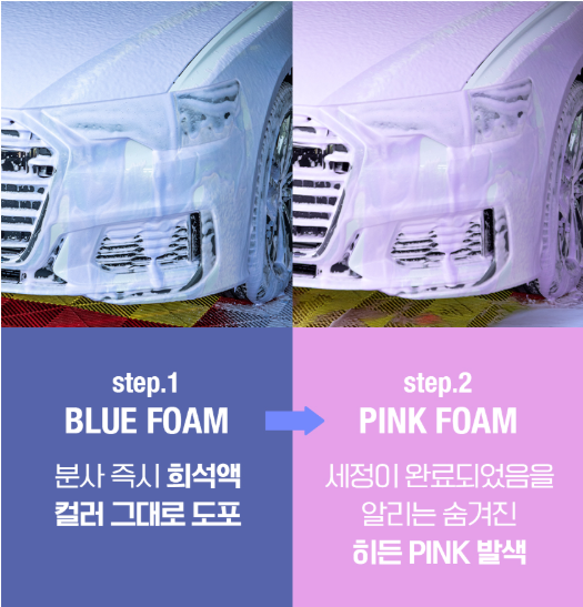 폼을 분사하면 푸른빛의 쫀쫀한 폼이 도장면에 도포되고, 오염물과 세정제 사이의 화학적 반응을 통해 푸른빛이 점차 흰색으로, 흰색에서 핑크색의 폼으로 변합니다. 핑크색으로 변할 때를 기다렸다가 고압수를 뿌려 헹궈내주시면 세차 끝!!