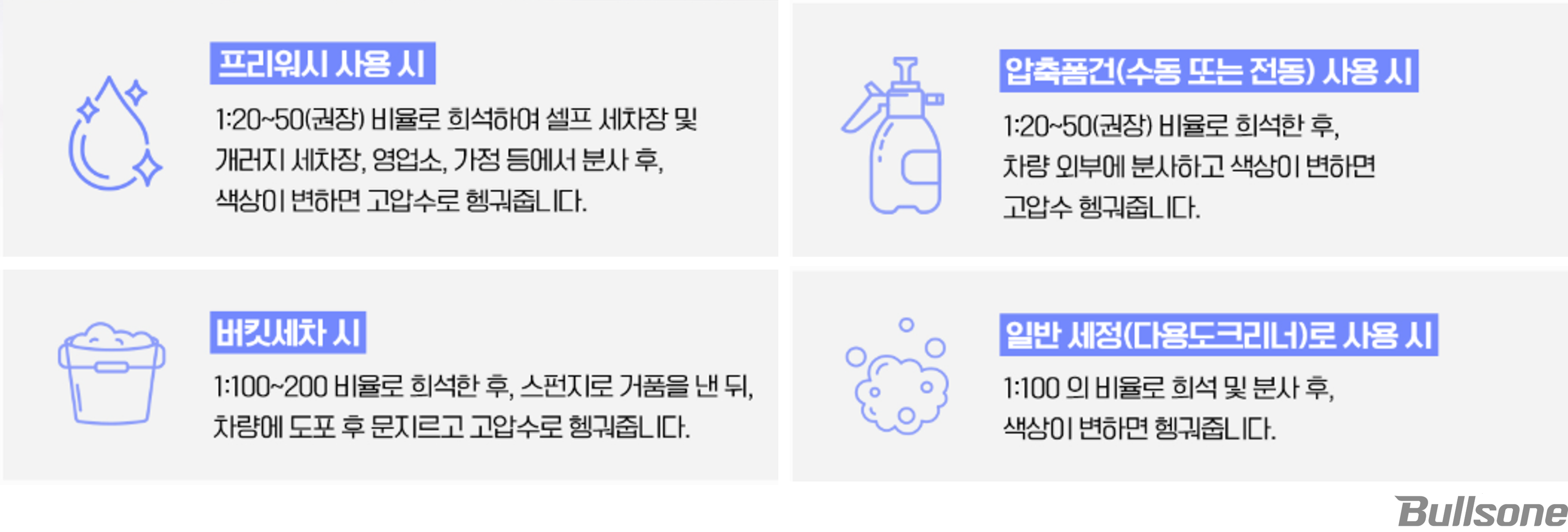 세정력의 핵심인 쫀쫀한 고밀도 폼은 불스원 연구소의 수많은 테스트 끝에 탄생한 가장 완벽한 농도로, 클리어층에 정확하고 강력하게 부착되도록 설계하여 흔들림 없는 고정력을 보여줍니다. 압축폼건이나 폼랜스, 버킷세차로도 활용할 수 있으니 위 희석 비율을 참고하셔서 컬러체인징 카샴푸의 활용도와 디테일러의 상황에 맞게 사용하실 수 있습니다.