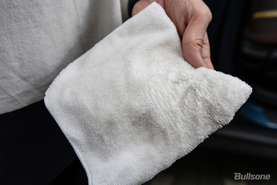 유색 시트의 오염은 우리 눈에는 잘 보이지 않지만 가죽 크리너로 지워보면 이렇게나 흰 극세사 천에 많은 묵은 때가 묻어나온답니다. 묵은 때와 오염을 제거해주면 가죽 시트의 번들거림을 지워주고 묵은 때와 오염을 제거해줄 수 있는데요.
