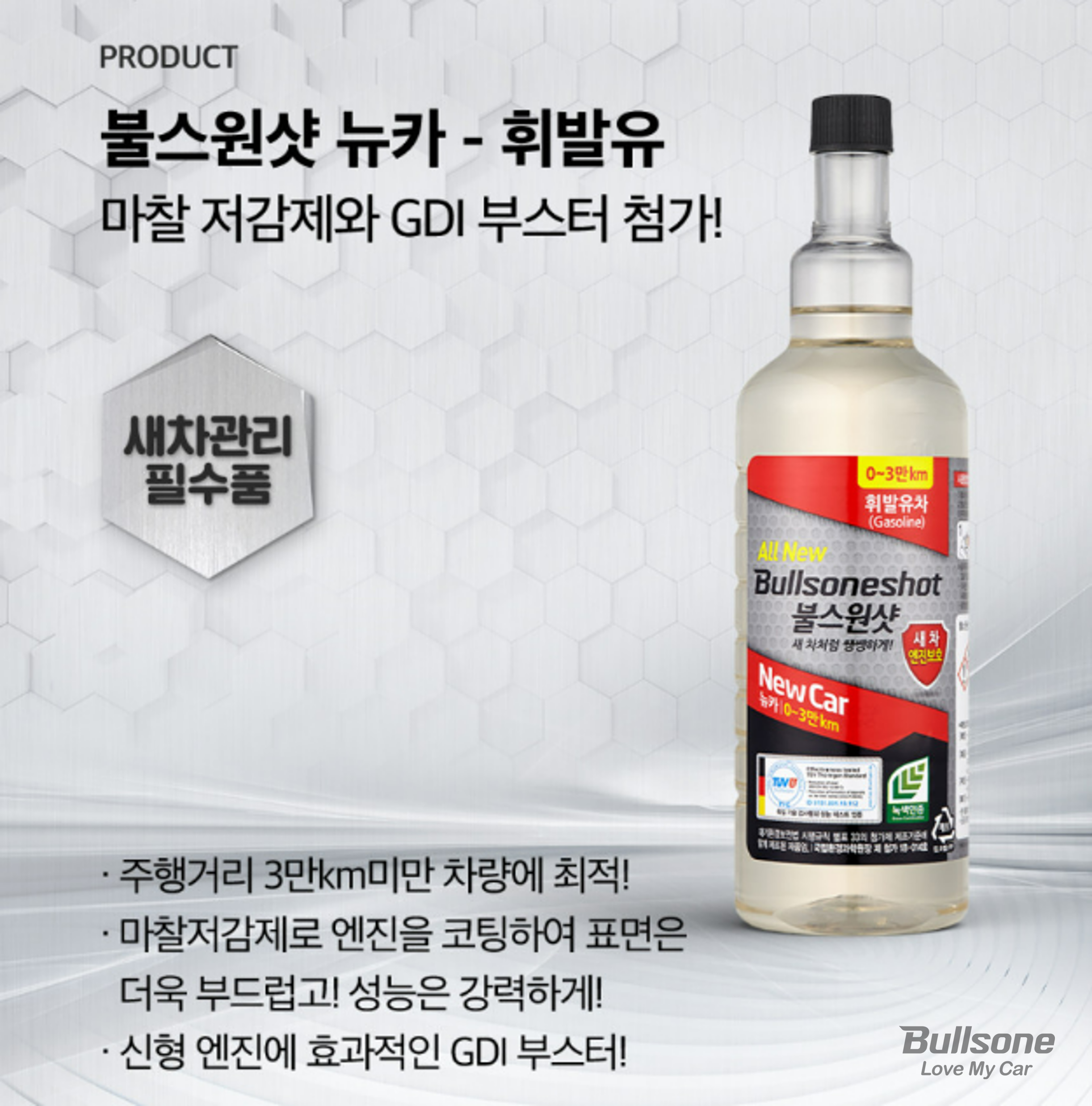 불스원샷 뉴카 휘발유는 진보된 세정 성분과 GDI 부스터로 연료분사장치에 엔진 때가 생기는 것을 방지합니다. 불스원샷 뉴카에 들어있는 마찰저감제 성분이 엔진 실린더를 코팅해 표면을 더욱 부드럽게 하고 성능도 향상시킵니다! 또한, GDI 부스터가 연소실의 엔진 때가 생기는 것을 방지하기 때문에 최적의 엔진 성능을 유지할 수 있습니다!