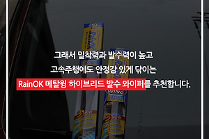 안녕하세요 불스원입니다. 비가 많이 내릴 때, 와이퍼가 시원시원하게 빗물을 닦아주지 못한다면 시야가 흐려져 운전하기 난감해집니다. 거기에 갑자기 고장이라도 난다면 이보다 더 난감할 때가 없겠죠. 특히나 초보 운전자라면 자동차 부품 교체는 어렵게 느껴질 것입니다. 하지만 이번 포스팅을 보고서 와이퍼 교체가 이렇게 쉬웠다는 것을 깨닫는다면 초보 운전자라도 차량관리에 자신감이 붙을 것 같습니다. 이번에 교체할 와이퍼는 새롭게 업그레이드된 RainOK 메탈윙 하이브리드 발수 와이퍼입니다. 4관절 메탈 프레임으로 밀착력을 높여주고 발수 고무가 시야를 가리는 빗물을 튕겨내어 빗길 운전 시 깨끗한 시야를 확보할 수 있는 것이 특징입니다. ※ RainOK 메탈윙 하이브리드 발수 와이퍼 특장점 확인하기 와이퍼 교체에 앞..