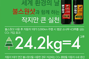 세계환경의날, 환경을 위해 자동차로 할 수 있는 작은 실천 한가지로 소나무 4그루의 효과가 나타납니다. 6월 5일은 전세계인이 함께하는 세계 환경의 날입니다.불스원샷과 함께 자동차로 할 수 있는 작은 실천 한가지를 실행해보는 건 어떨까요?이산화탄소 배출량도 줄이고 연비도 챙기는 똑똑한 환경지킴이, 바로 여러분입니다 ^^