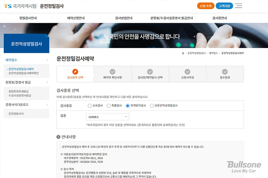 TS 국가자격 통합 시스템을 통해 사전 예약 신청을 하시면 됩니다. 운전정밀검사예약에서 자격유지 검사를 선택하고 예약을 진행해주세요.